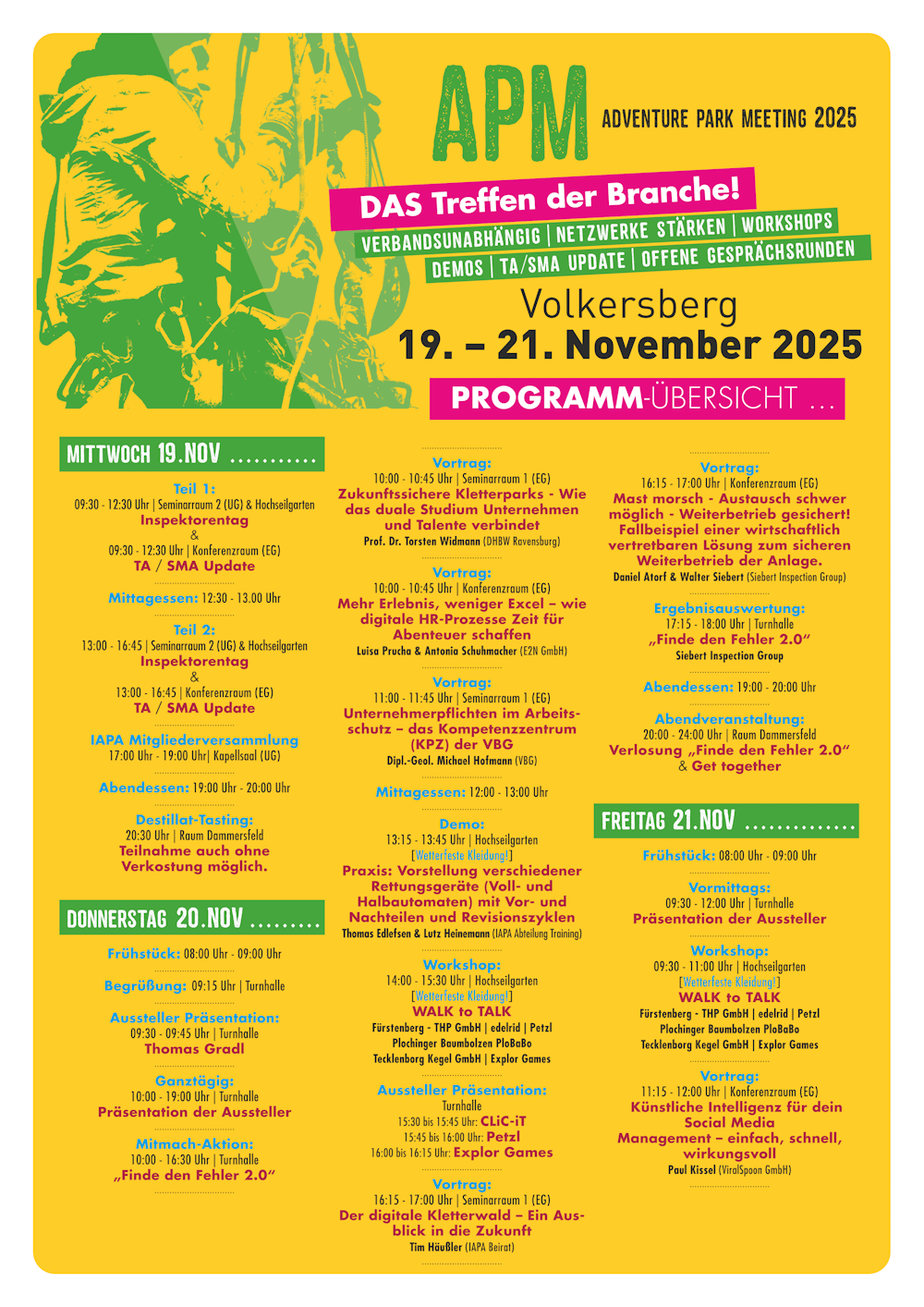Lasst euch inspirieren, knüpft neue Kontakte mit anderen Betreibern, Herstellern oder Mitstreiter der Kletterwaldszene – und erlebt, wie stark unser Netzwerk wirklich ist.
